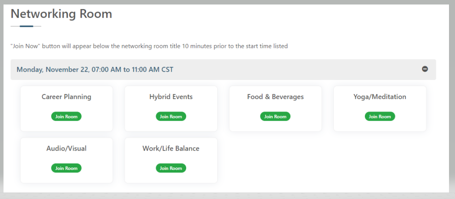 5. From here you can view every Networking Room available, the times they are open, and the topics being covered